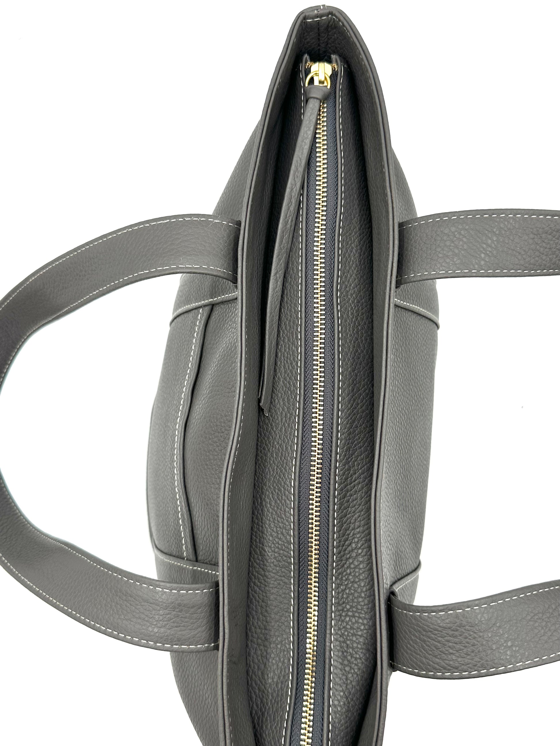 We like to imagine trendsetter and fashion muse Carolyn Bessette-Kennedy would have appreciated the simple lines and sturdy structure of this re-imagined coastal classic tote, which reflects who she appeared in life: stylish but practical, serious but fun. We used our unlined pebble leather in saturated colors with colorful top stitching because it is light but sturdy, unfussy and yet full of personality. Thick handles give it heft and can take a day of running around on errands or from meeting to meeting either on your shoulder or in hand. This heavy lifter bag is large enough to carry all your necessaries, including a laptop. The unlined interior features a side zipper compartment and a zipper closure on top ensures security.
