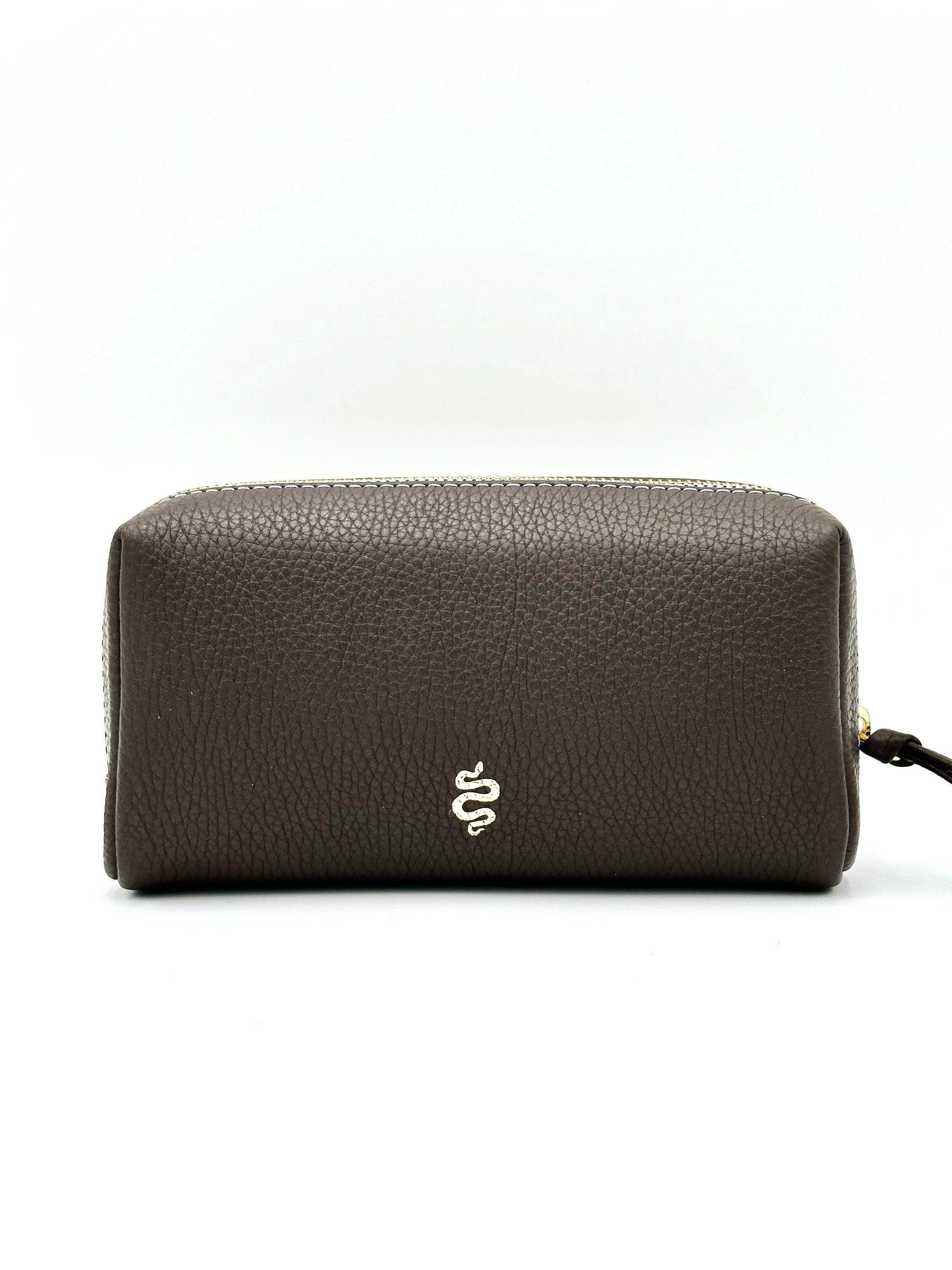 Like its larger companion, our small makeup bag helps you keep your handbag (and life!) neat and tidy. Lipsticks, hair ties, cover ups and more stay tucked away in this adorable pebble leather makeup bag with a sturdy brass zipper. And you can’t help but smile at the contrast leather interior every time you open it up.