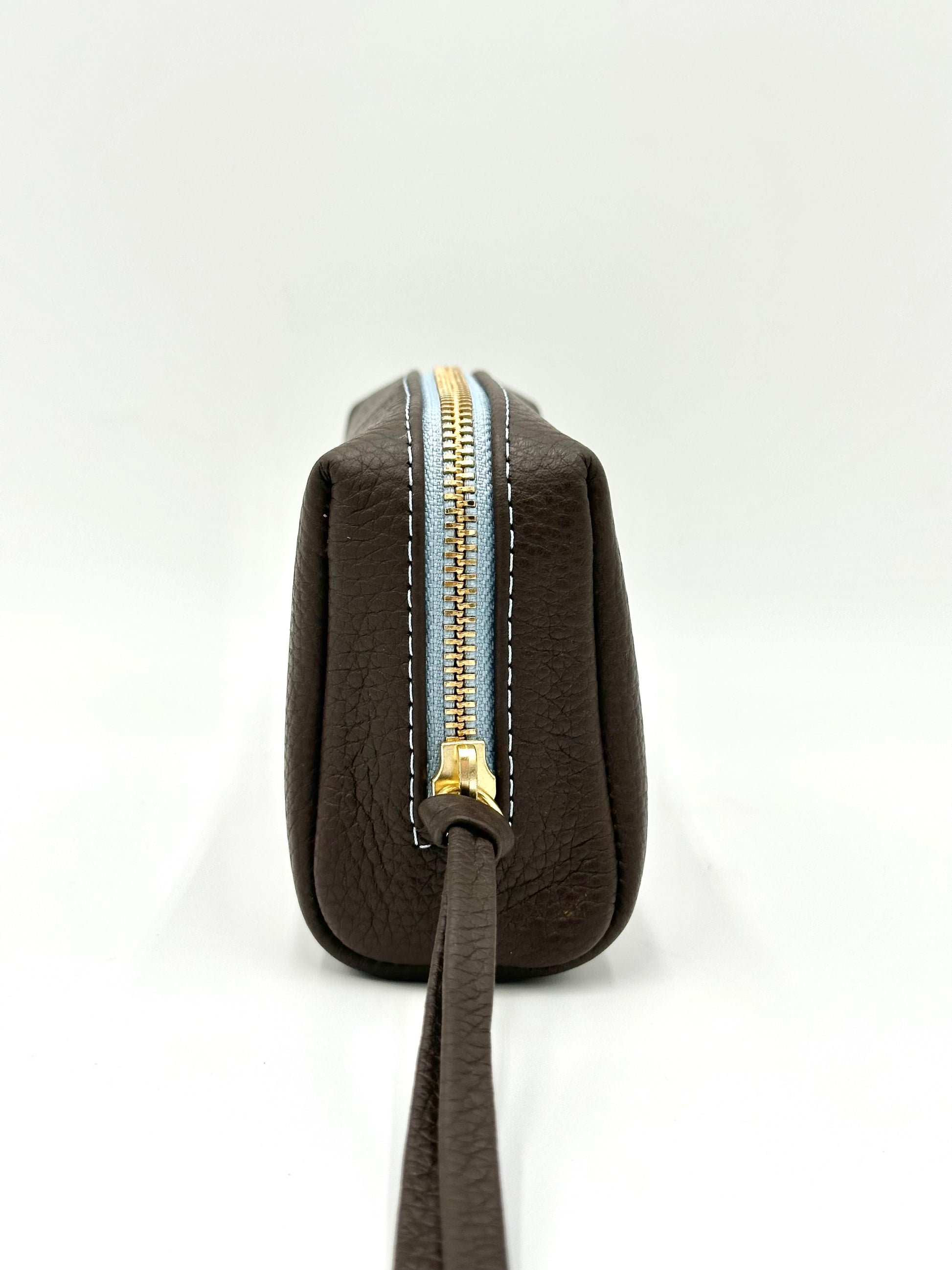 Small Makeup Bag in Espresso with a Sky Blue Interior