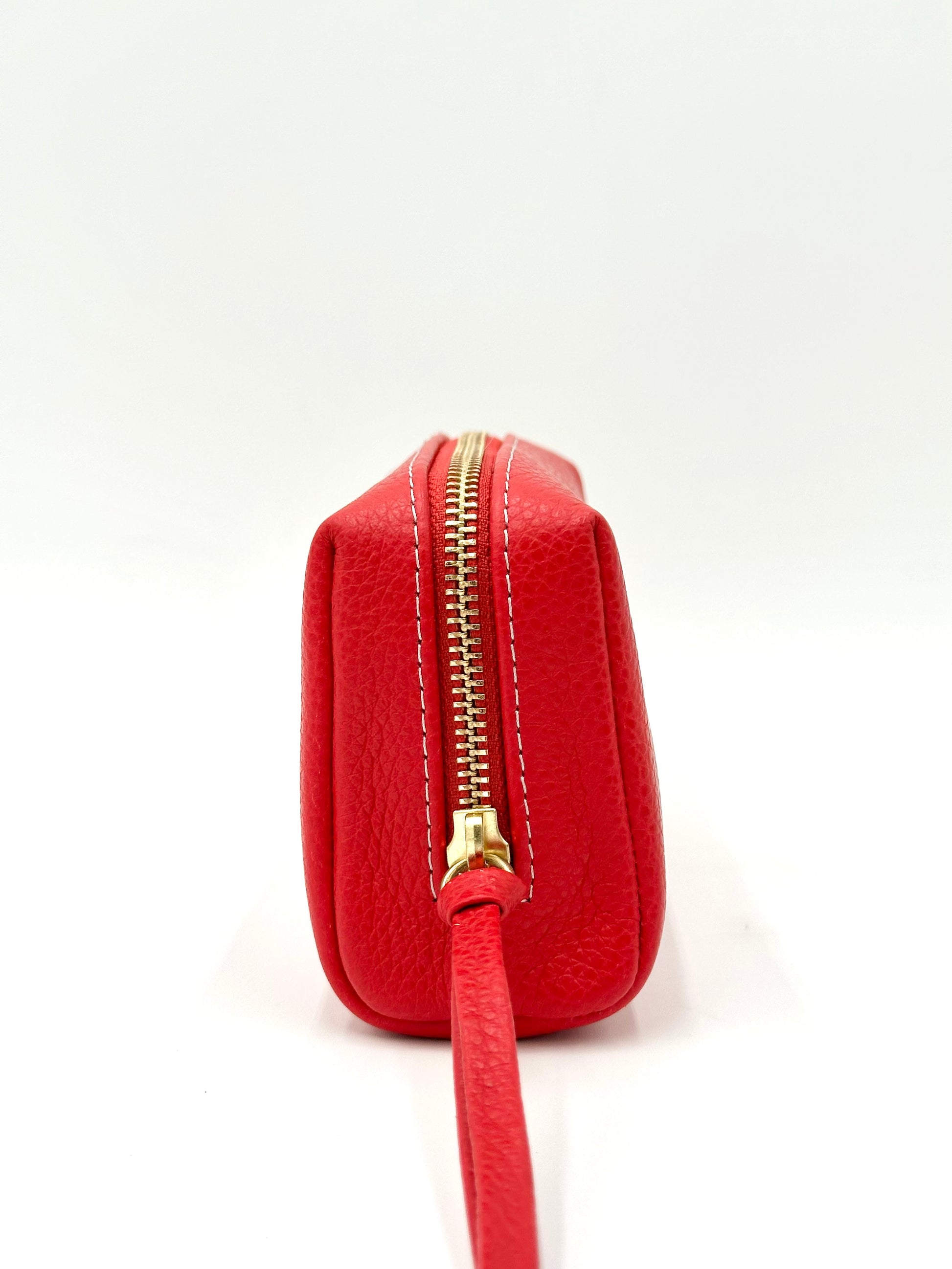 Our Silver makeup bag is lined in powerful Lipstick Red leather. The Silver makeup bag keeps smaller things wrangled and its zipper runs base-to-base, making it easy to open and see all that you have managed to shove in there.