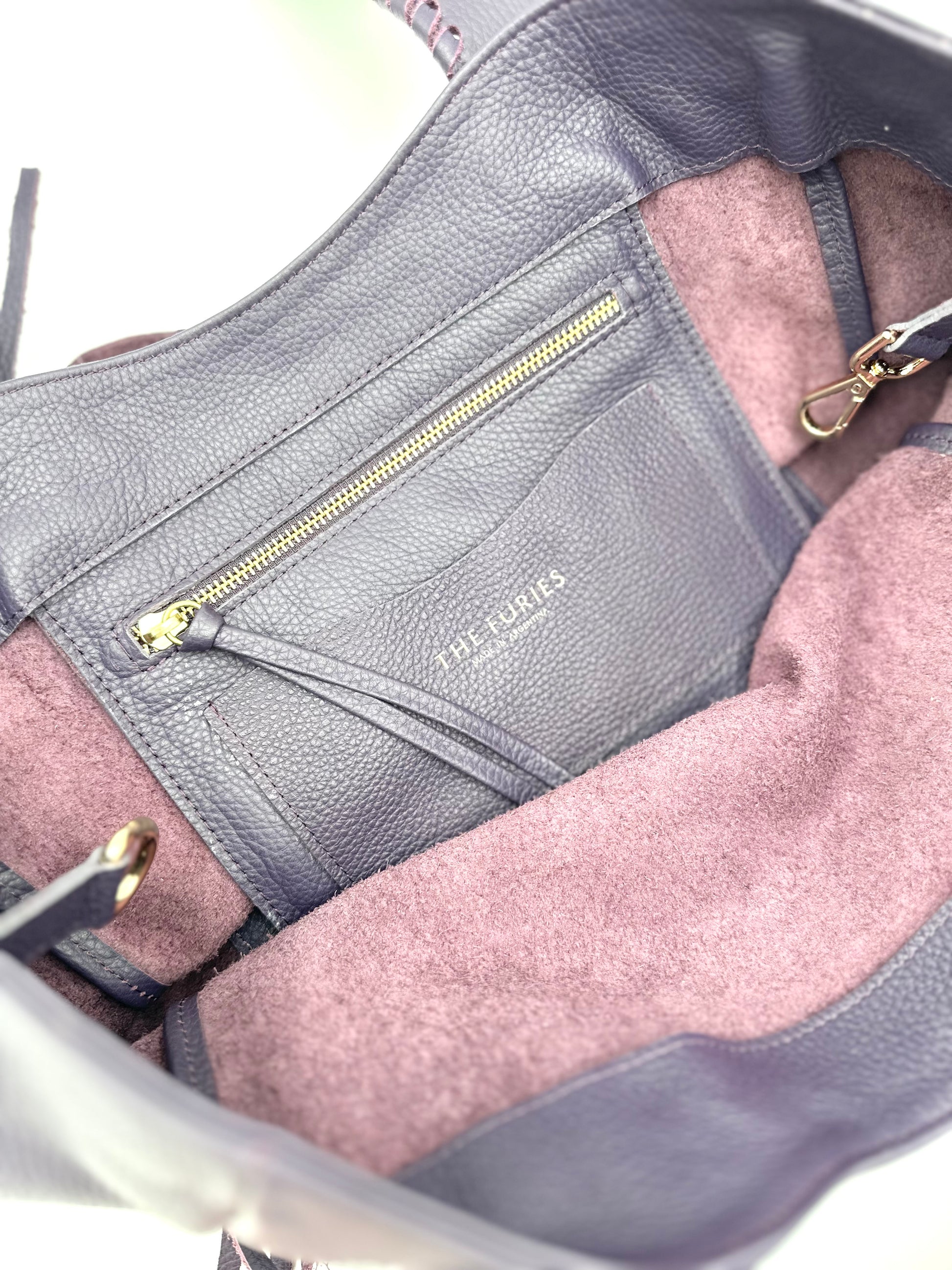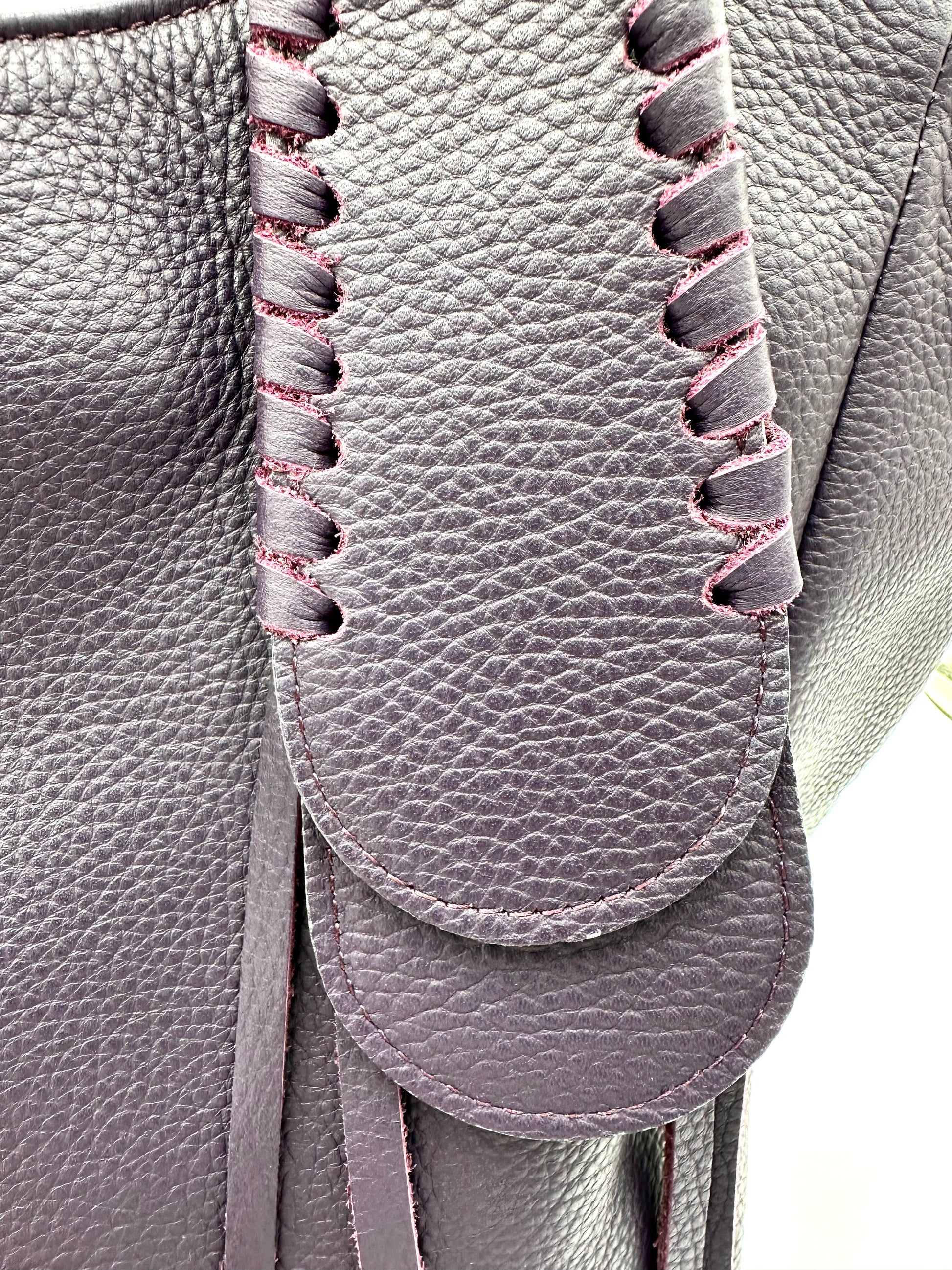 Eggplant is the new black. A dark purple pebble leather that reads neutral but is anything but boring.